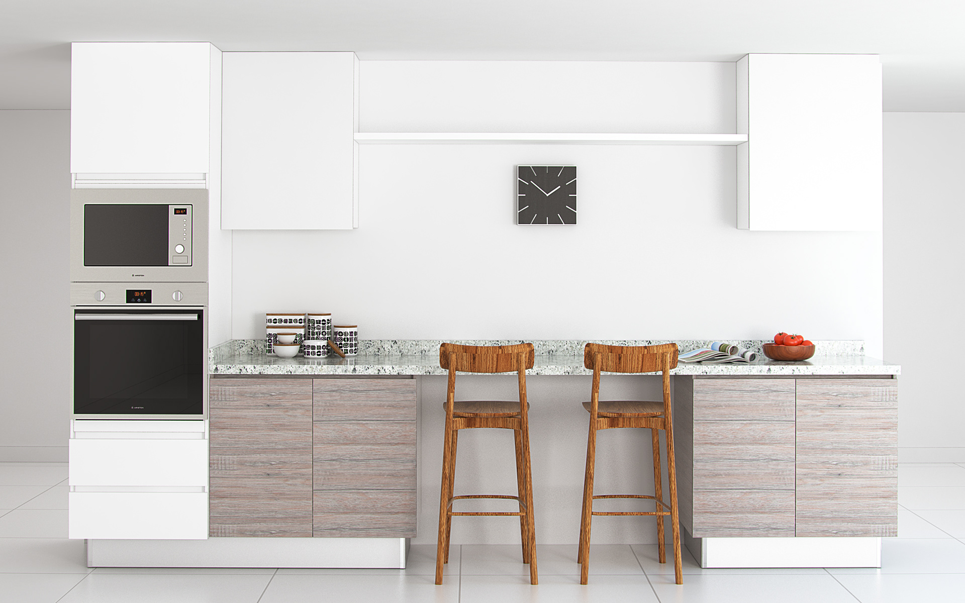 Diseño de cocina Muebles usperiores en laminado blanco DuraGloss Muebles bajos color Capuchino Mesón Sunset Grey *Modelos 3D propios, NURBS22 y Model+Model